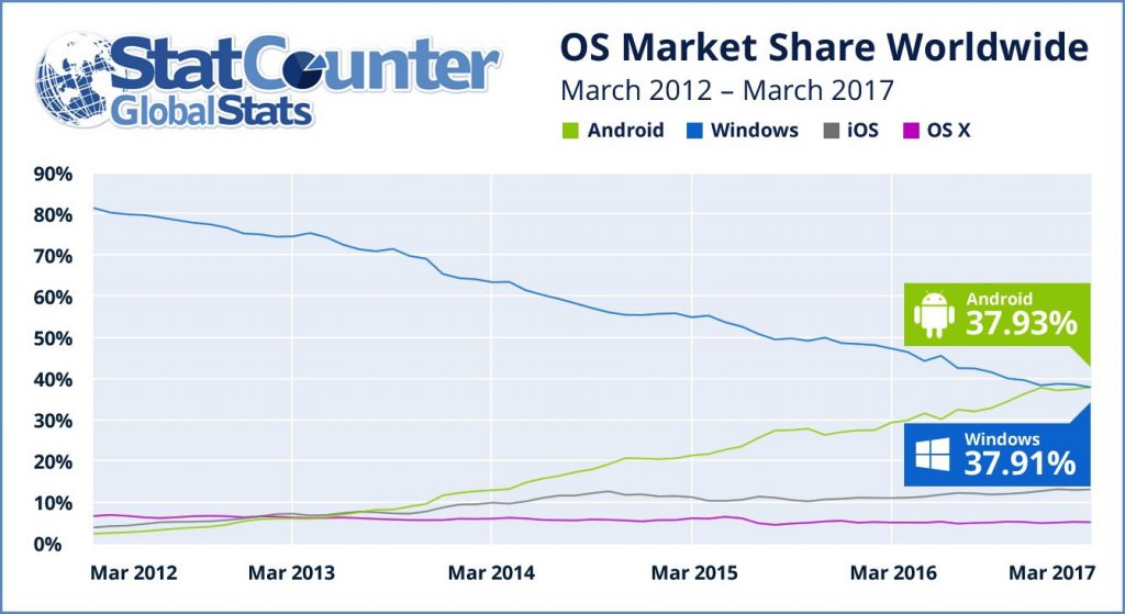 Un informe previo de la citada firma ya hablaba del acercamiento de Android a Windows, reportó que Windows, en sus diversas versiones, está instalado en más del 80% de ordenadores a nivel global, Android hace lo propio en 88% de su mercado, los móviles.