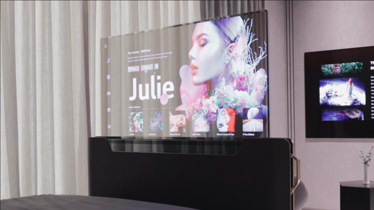 Adicional a las pantallas curvas y enrollables, también se presentó una pantalla transparente de 55 pulgadas.