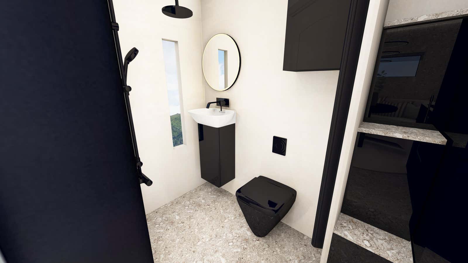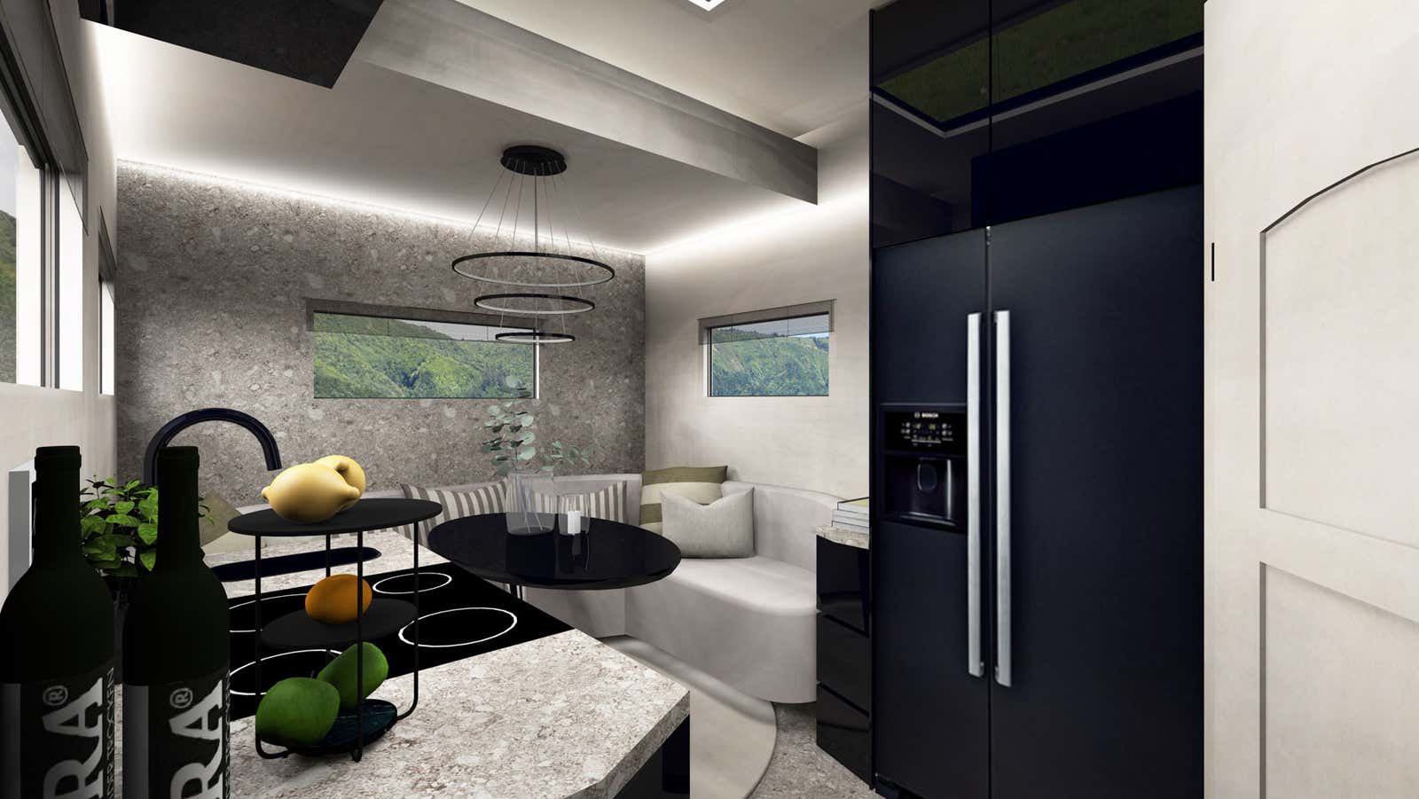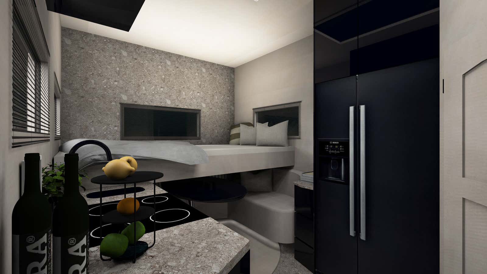 Sobre esta recia montura, SOD se ha dedicado a montar un microapartamento con cocina completa, frigorífico combi, un sofá rinconero y una cama enorme que desciende mediante railes motorizados sobre la zona del salón cuando toque dormir un rato