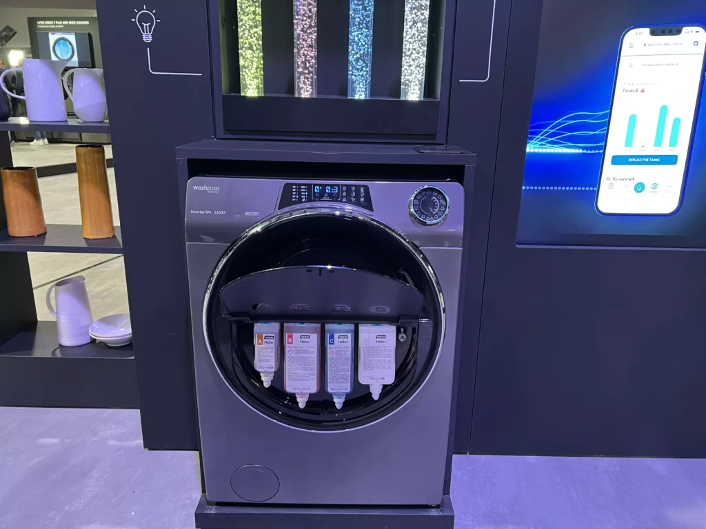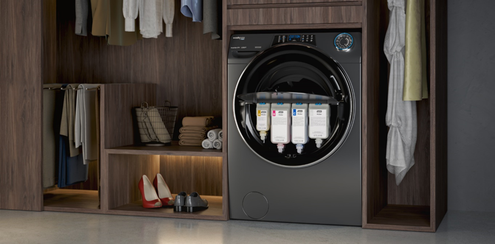 Washpass gira alrededor de un modelo de lavadora de Haier en cuya parte frontal hay un compartimento con una serie de depósitos de detergente intercambiables, un poco como si fueran cartuchos de tinta gigantes.