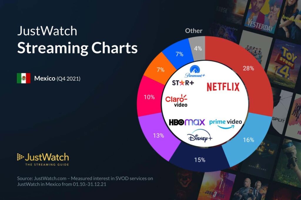En México, la tarta es similar, pero Netflix sigue claramente por encima de Amazon Prime Video. En el cuarto trimestre de 2021, Netflix tenía un 28% de cuota de mercado, Prime Video un 16%, Disney+ un 15%, HBO Max un 13%, Claro Video un 10%, Star+ un 7% y Paramount+ un 7%. Aquí las ganadoras fueron Star+ (de Disney), que creció 5 puntos y HBO Max, que subió 2.