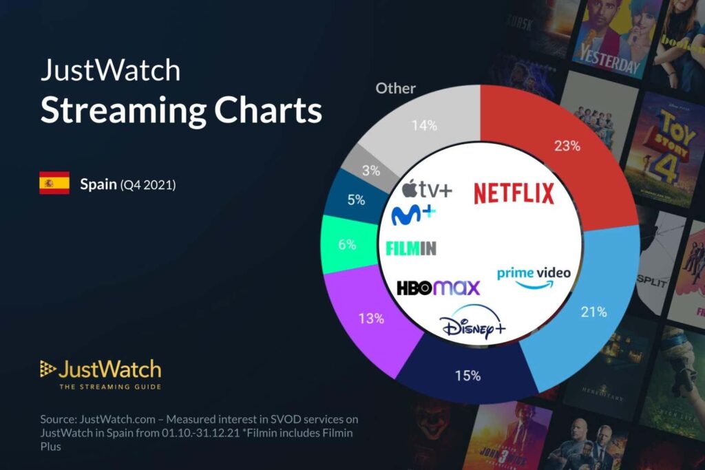 Según JustWatch, las plataformas de streaming más populares en España son Netflix (23% de cuota de mercado), Prime Video (21%), Disney+ (15%), HBO Max (13%), Filmin (6%), Movistar+ (5%) y Apple TV+ (3%). A pesar de seguir siendo las plataformas líderes, Netflix y Amazon Prime Video perdieron cuota de mercado de manera persistente a lo largo de 2021. Netflix perdió 5 puntos porcentuales y Prime Video, 3 puntos porcentuales entre enero y diciembre.