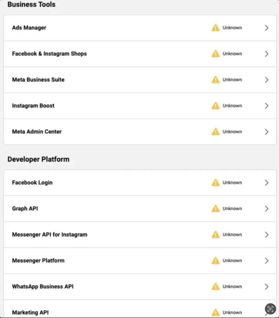 La página de estado de Meta mostró todos sus productos con un estado “desconocido” a las 11:35 am ET, aproximadamente una hora y media después. comenzó el apagón.