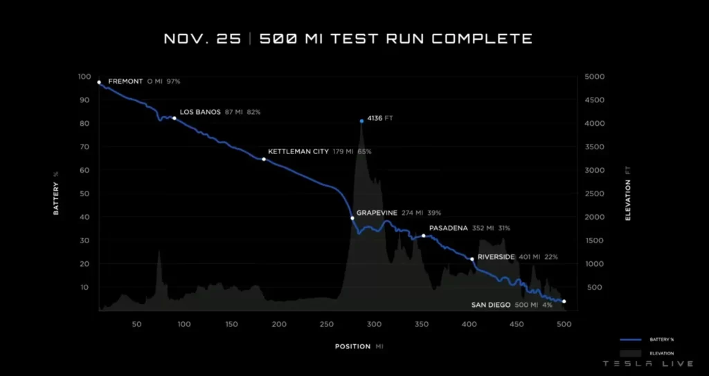 Por cierto, según Tesla, Semi puede tener un alcance aún mayor, ya que completó el viaje de 500 millas con un estado de carga del 97 % y le quedó un 4 % al final. Palabra de Musk.