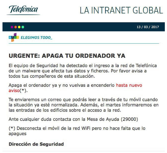 El ciberataque que presenta Telefónica, ha ocasionado que su intranet quede bloqueada, lo cual trajo como consecuencia que la empresa ordenara a todos sus trabajadores apagarán todos sus equipos informático