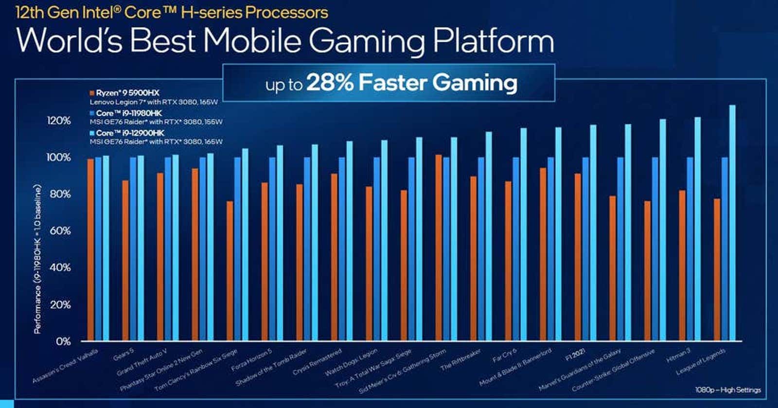 Intel comparó el procesador Core i9-12900HK de primer nivel con los de AMD y Apple, al enfrentar un MSI GE76 Raider con una CPU Core i9 y una GPU RTX 3080 contra un MacBook Pro 16 con un M1 Max y un Lenovo Legion con una CPU Ryzen 9 5900HK y una RTX 3080.