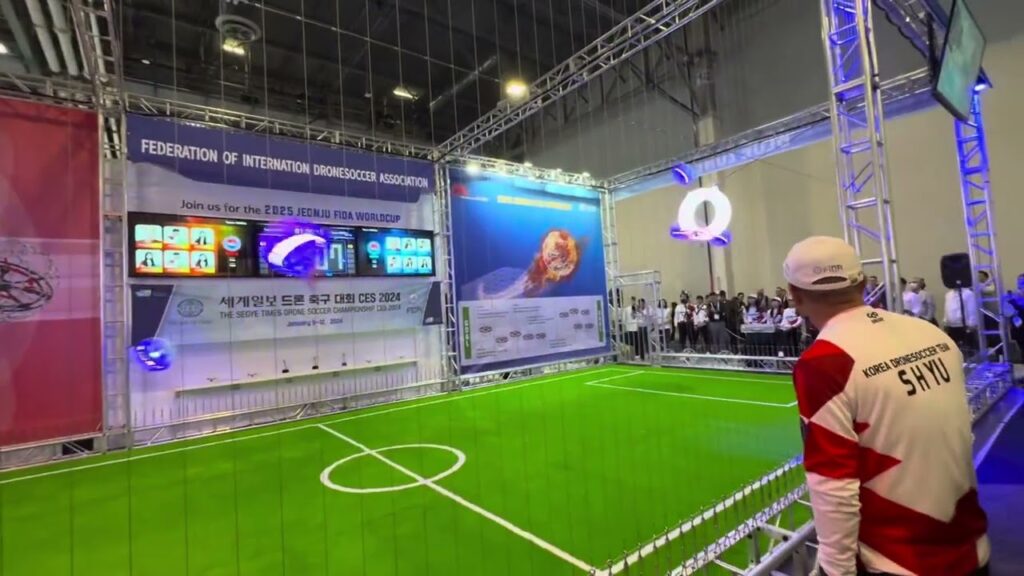 Sí, se estaba celebrando un partido de fútbol con drones FIDA en la pista de exhibición del CES.