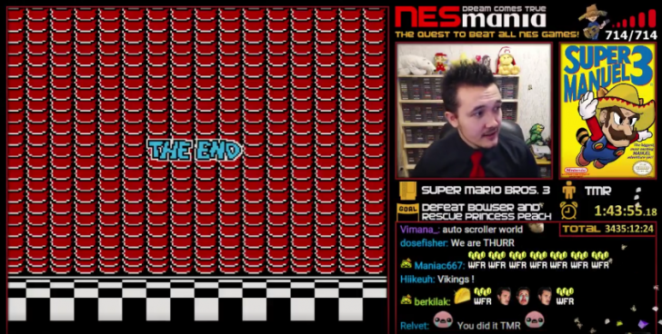 El día de ayer 26 de febrero de 2017, y después de más de 3,400 horas el reto se cumplió y TheMexicanRunner completó el último juego que le faltaba (y probablemente el mejor del NES): Super Mario Bros 3. Esto lo hizo en una transmisión en vivo a la cual acudieron más de 12,000 espectadores, algo que también hizo que obtuviera una buena cantidad de donaciones.