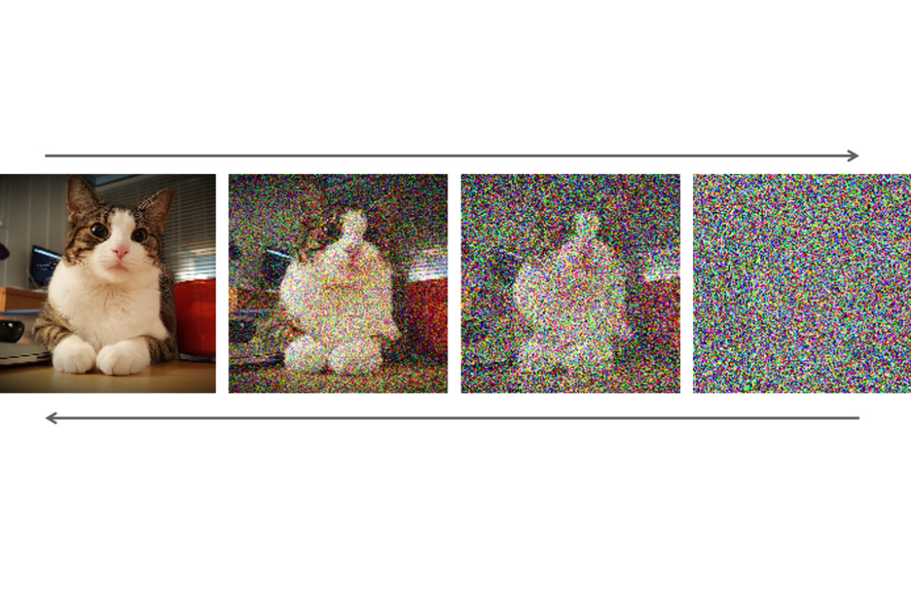 El proceso de creación comienza con una imagen totalmente degradada. El modelo de difusión registra la secuencia de degradación y luego ejecuta el camino inverso: