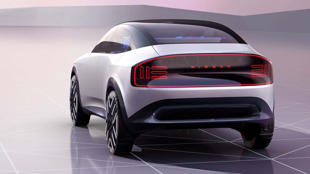 El único que aparentemente existe en el presente es el Chill-Out, que se parece mucho a un Ariya más pequeño y deportivo. Se ve lo suficientemente interesante, pero no se arriesga mucho, salvo en las luces traseras. Casi parece que los diseñadores de Nissan copiaron y pegaron los LEDs en forma de píldora del nuevo Z varias veces, pero encajan del todo con la barra de luz que los rodea, ni con la parte negra brillante en la que se encuentran. Es un diseño limpio, pero recargado.