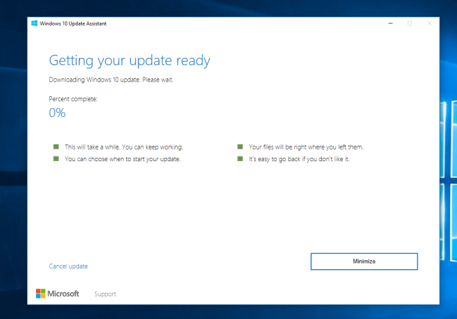 Windows 10 Update Assistant nos informará sobre la disponibilidad y descarga de Creators Update dándonos la bienvenida con el siguiente mensaje