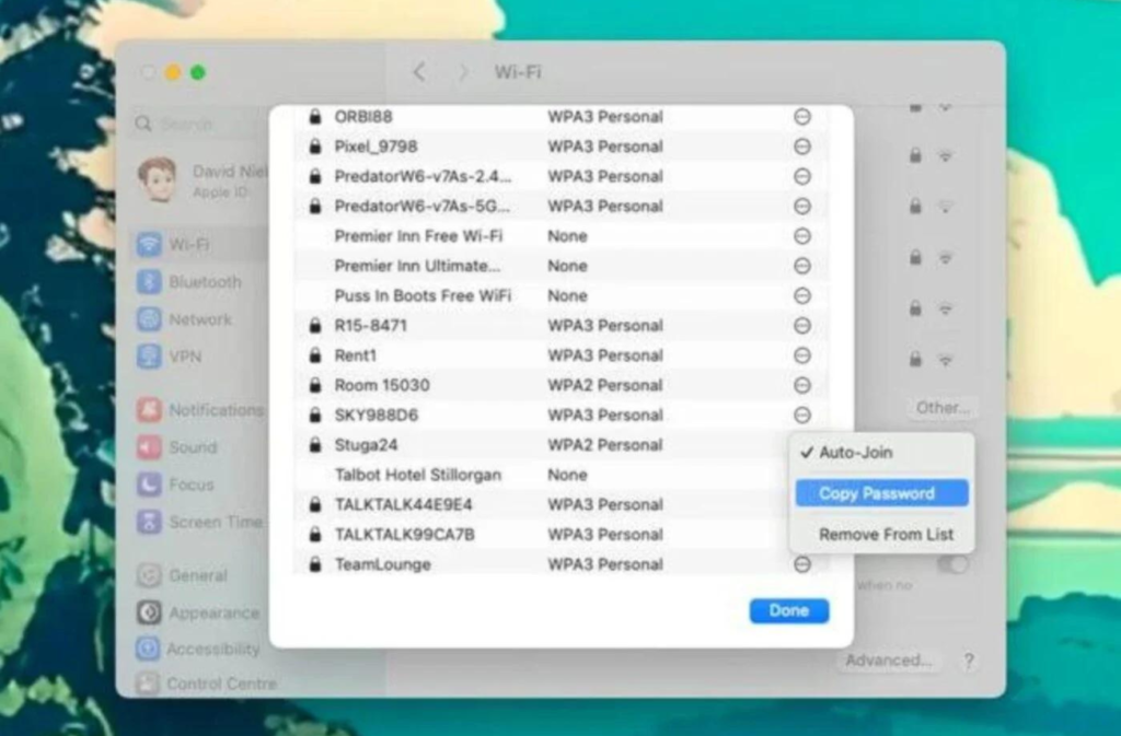 Abre el menú Apple y ve a Ajustes de Sistema y elige Wi-Fi. Luego busca la red a la que te conectaste en Redes Guardadas, donde encontrarás tres puntos, y allí elige Copiar Contraseña. Se copiará y tendrás que pegarla en la app de Notas o en TextEdit (Cmd+V te servirá).