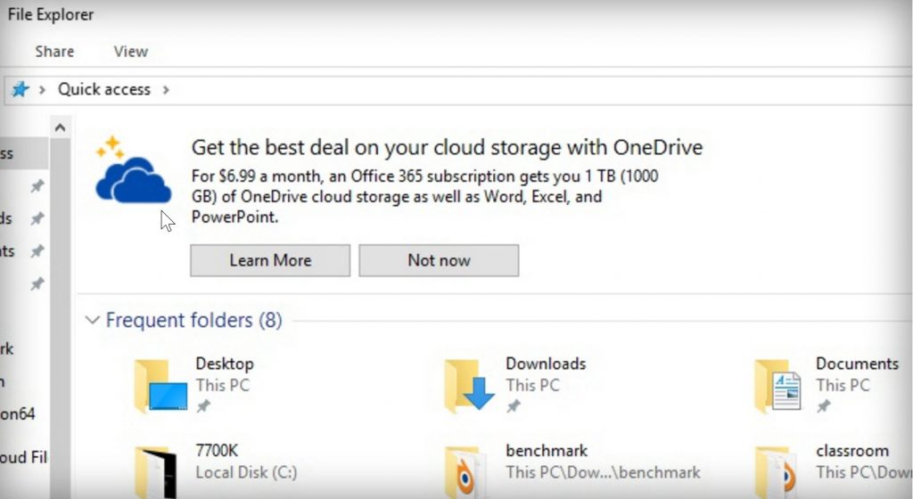 Varios usuarios en Reddit, y hasta el gurú de Windows Paul Thurrott, han tomado captura del mensaje que OneDrive está mostrando en la sección de Accesos Directos del Explorador de Windows. Esta sección, es la que aparece justo cuando abres el Explorador de Windows o abres una nueva ventana del mismo.