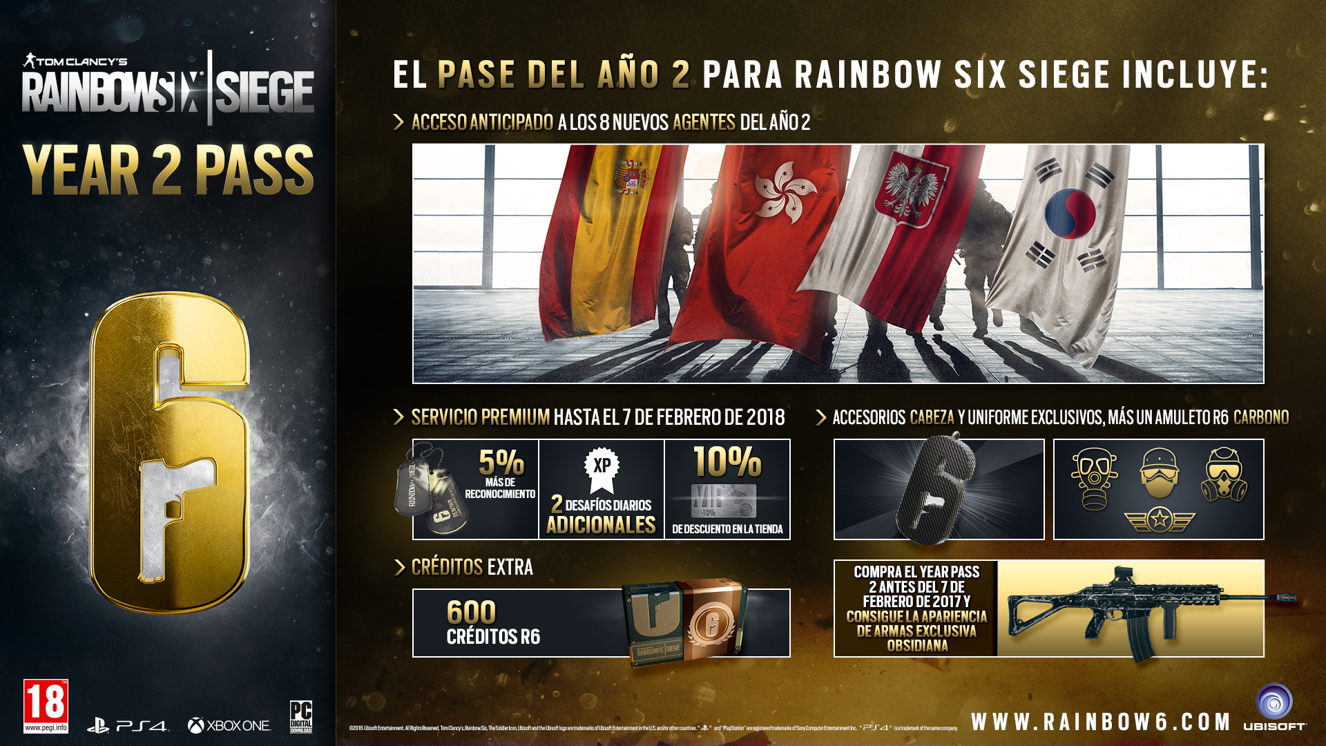 Tom Clancy’sRainbow Six Siege Year 2 Pass (el pase del año 2) te garantiza el acceso a la condición de miembro VIP Premium durante un año**, que incluye:
