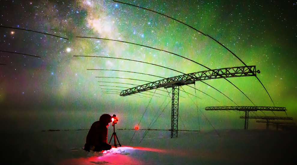 SuperDARN vigila y explora los efectos del geomagnetismo en la alta atmósfera de la Tierra. Aunque algunas de sus antenas se hallan en el Polo Sur; la red se extiende por todo el mundo y está presente tanto en el hemisferio norte como en el sur. Uno de los efectos del geomagnetismo se ha capturado en todo su esplendor en esta fotografía, que muestra tenues cortinas y rastros de luz verde que destacan en la oscuridad nocturna por encima de las antenas: una aurora.