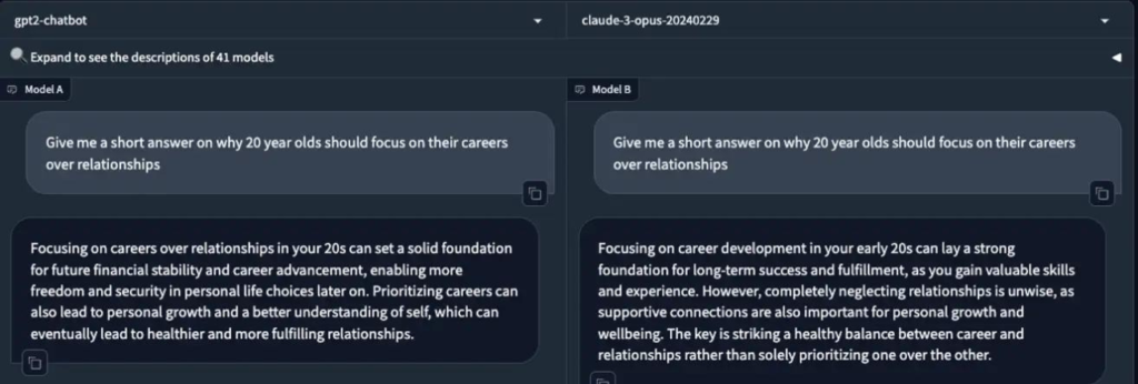 Comportamiento exclusivo para modelos avanzados de lenguaje grande, razonando bien y delineando planes detallados para tareas complicadas. Estos son algunos de nuestros ejemplos que comparan gpt2- chatbot (izquierda) y modelo Claude Opus de Anthropic (derecha).
