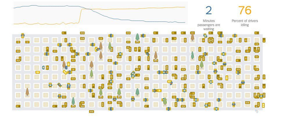 Gracias a ello, se han aceptado en el programa a miles de conductores más de los teóricamente necesarios para satisfacer la demanda. Uber pretende brindar servicio en cinco minutos o menos, lo que beneficia enormemente al cliente, pero ha causado que los conductores pasen cada vez más tiempo sin un viaje. Así lo muestran un par de gráficas realizadas por el New York Times.