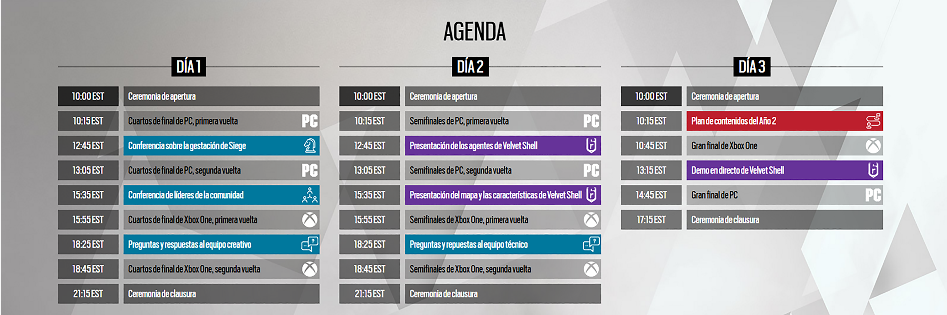 El torneo entero se retransmitirá en directo a través del canal oficial Twitch. Nuestros comentaristas e invitados te acompañarán durante toda la competición Rainbow Six: Siege y te mantendrán informado, mientras los desarrolladores presentan los detalles de la próxima operación Velvet Shell a través de las preguntas y respuestas, las conferencias sobre la creación de Siege, las charlas, presentaciones y demostraciones en directo. Además, una multitud de miembros influyentes de la comunidad visitarán el evento en persona, en Montreal. Aquí tienes la lista de “personalidades” y talentos del evento.